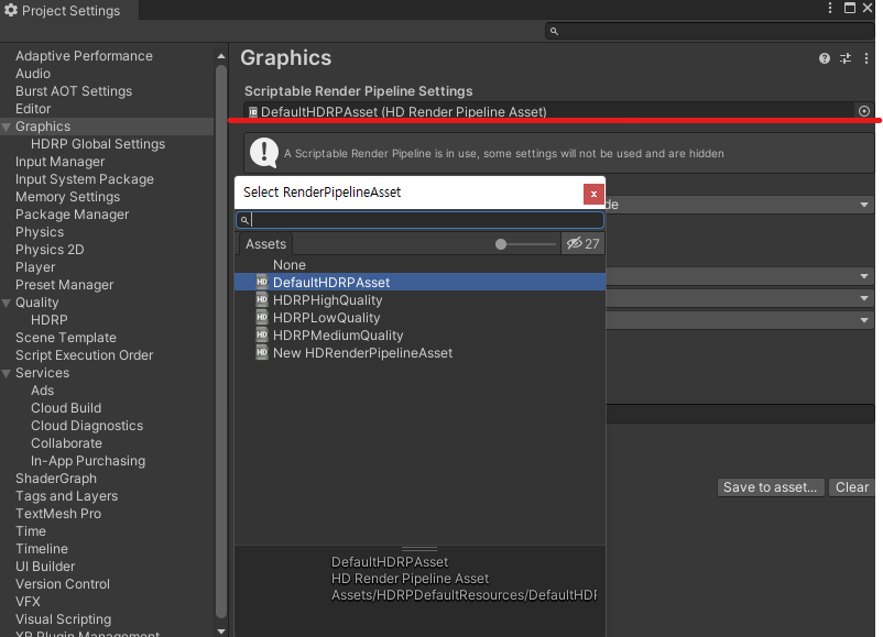 HDRP에서는 몇 개의 HDRP 에셋을 미리 만들어두고 필요시에 변경할 수 있다.